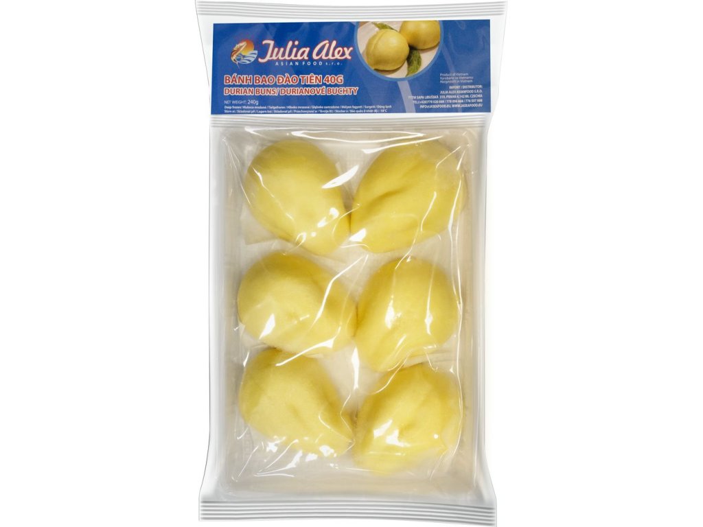 Složení: Pšeničná mouka, voda, cukr, durian 7.2 %, rafinovaný sójový olej, kokosový prášek, prášek do pečiva (emulgátor E450, kypřící látka E500, maniokový škrob, protispékavá látka E341i), droždí (obsahuje emulgátor E491, antioxidant E300), sůl, barvivo (E160a, cukr, voda, slunečnicový olej, emulgátor E472, antioxidanty E307, E304) Ingredients: Wheat flour, water, sugar, durian 7.2%, refined soybean oil, coconut powder, baking powder (emulsifier E450, raising agent E500, cassava starch, anticaking agent E341i), yeast (contains emulsifier E491, antioxidant E300), salt, color (E160a, sugar, water, sunflower oil, emulsifier E472, antioxidants E307, E304)
