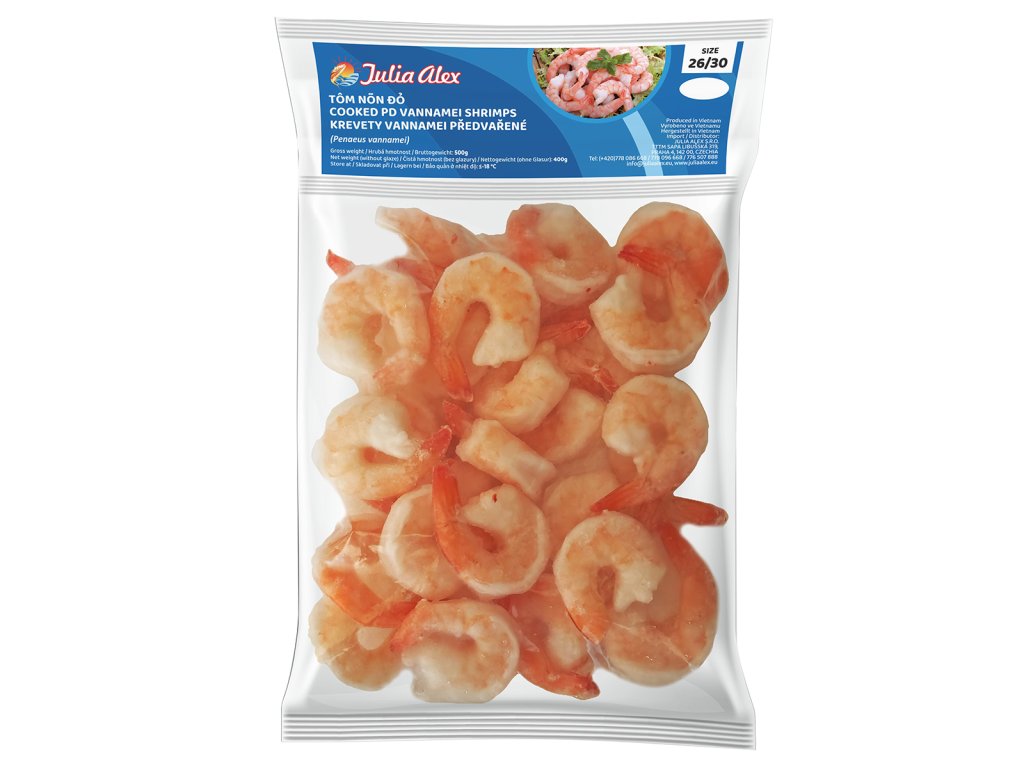 Tôm nõn đỏ 26/30 không đầu không vỏ | Krevety Vannamei 26/30 vařené bez hlav, loupané | Vannamei shrimp 26/30 cooked headless, peeled | Vannamei-Garnelen 26/30 gekocht, kopflos, geschält