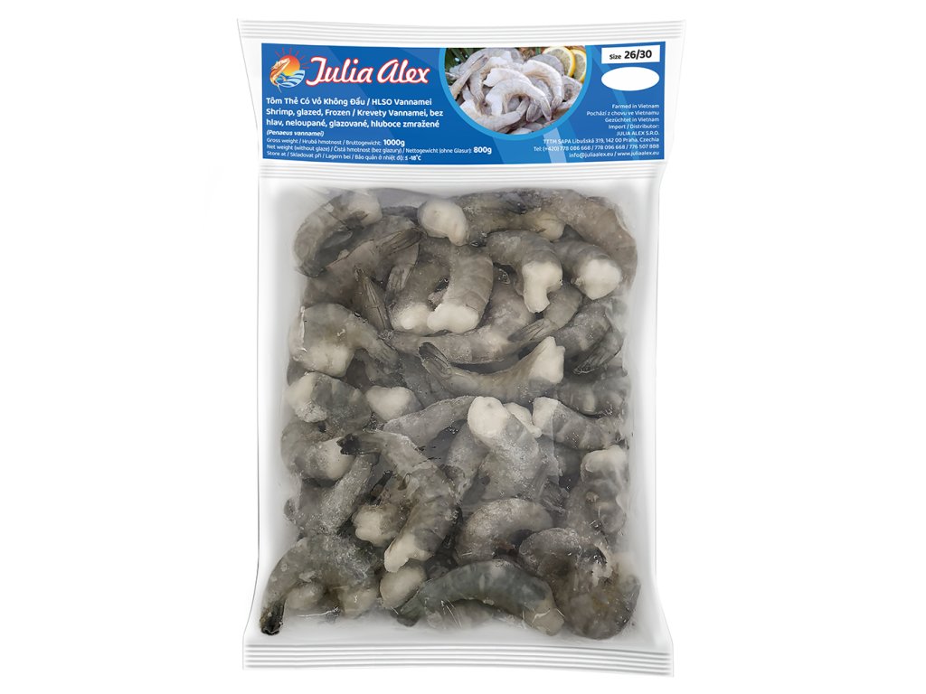 Vannamei shrimp 26/30 unpeeled, headless 10x1kg