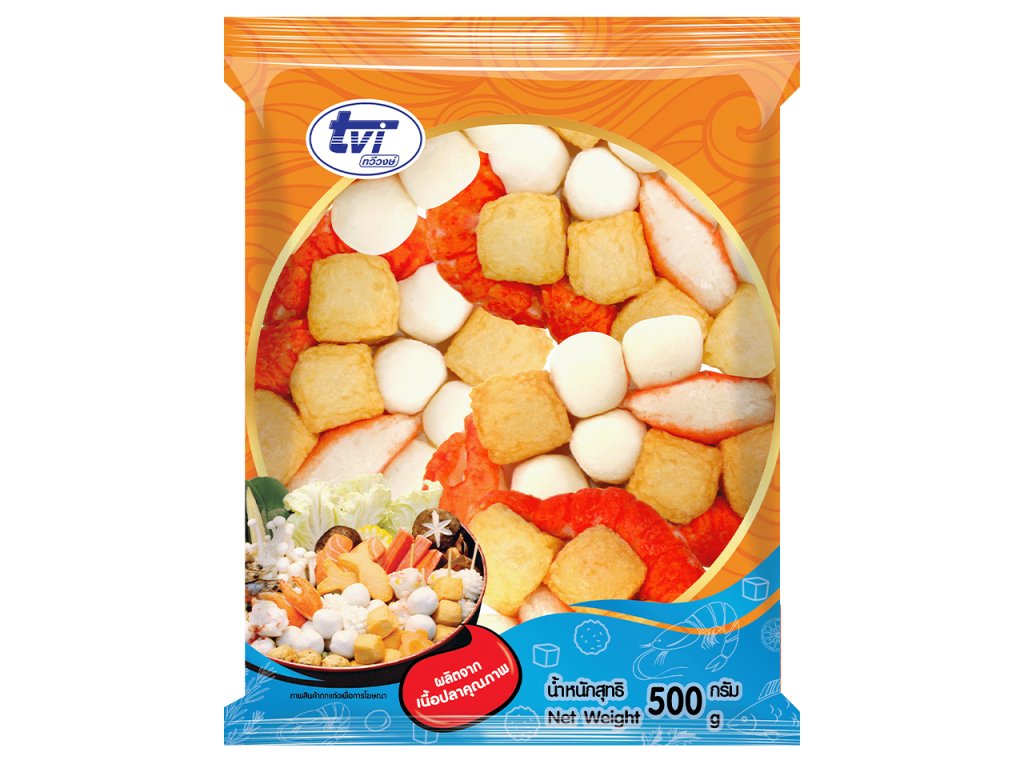 Složení: mleté rybí maso 41,30% (ryby (špičatník: nemipterus spp.), cukr, stabilizátory: E451, E450, voda 34,63%, modifikovaný tapiokový škrob (zahušťovadlo: E1412, E1420), zcela rafinovaného sójového oleje 4,20%, sójové mléko 3,50%, palmový tuk (nehydrogenovaný), cukr, sůl, izolovaný sójový protein, látka zvýrazňující chuť: E621, prášek z vaječného bílku, pšeničný škrob 0,30%, příchuť (lepek, sója), česnek, zpevňující látka: E170, E509, přírodní barvivo: E120, E160c, krabí extrakt (korýše, ryby), zvlhčující látka: E451(i)