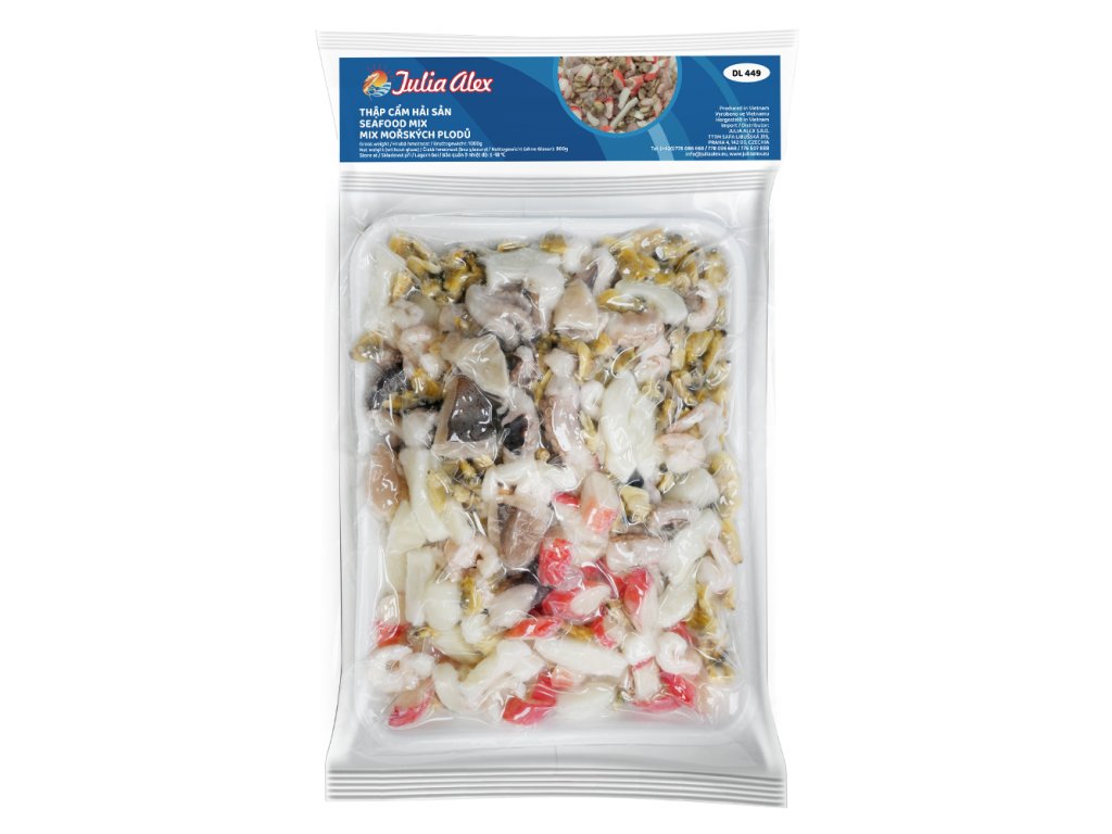 Složení: Vařené maso ze žluté škeble (Paphia undulata) 30%, Blanšírované sépiové proužky (Sepia spp) 20%, Krájená chobotnice (Octopus membranaceus) 20%, Surimi (voda, ryba (Nemipterus virgatus)) 20%, tapiokový škrob, cukr, sójový olej, sůl, látky zvýraznňující chuť E621, Krabí aroma, Pšeničná vláknina, Sójový protein, Emulgátor (E450, E451), Farbstoff (E120, E160C), Blanšírované pudingové krevety (Parapenaeopsis Hardwickii) 10%, sůl. Ingredients: Yellow Clam Meat Cooked (paphia undulata) 30%, Blanched cuttlefish strips (Sepia spp) 20%, Blanched Octopus cut (Octopus membranaceus) 20%, Surimi (water, fish, (Nemipterus virgatus), tapioca starch, sugar, soybean oil, salt, E621, crab flavor, wheat fiber, soybean protein, E450, E451, E120, E160c) 20%, Blanched pud shrimps Parapenaeopsis Hardwickii) 10%, salt.