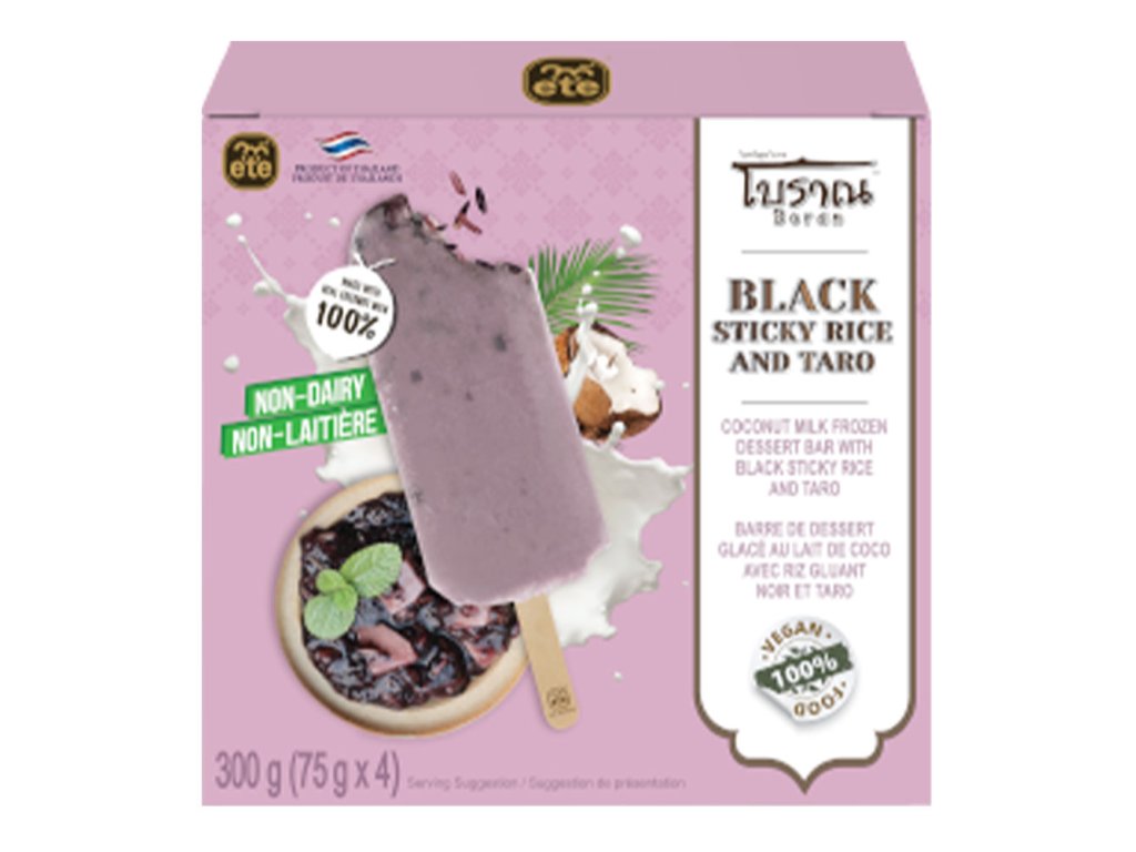 Složení: Kokosové mléko (kokos, voda) (33 %), slazená černá lepkavá rýže a taro (voda, černá lepkavá rýže, fruktózový sirup, taro, cukr) (30 %), voda (20,79 %), cukr 10 %, glukózový sirup ( 3,5 %), prášek taro (taro, dextróza, aroma), modifikovaný tapiokový škrob, stabilizátory (E466, E407), emulgátor (E471), aroma taro, sůl. Může obsahovat stopy následujících alergenů: skořápkové plody, vejce, obiloviny obsahující lepek, mléko (včetně laktózy), sója.